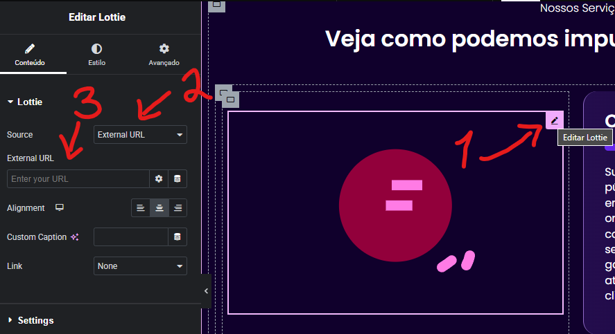 Then open the landing page editing and where you have the Lottie animations, you click to edit and in Source leave the External URL option selected and in the External URL field you paste the animation URL. And do this with all the animations.